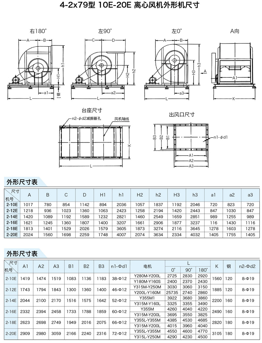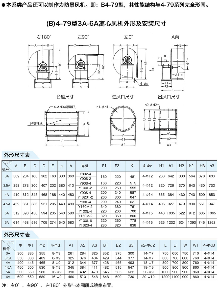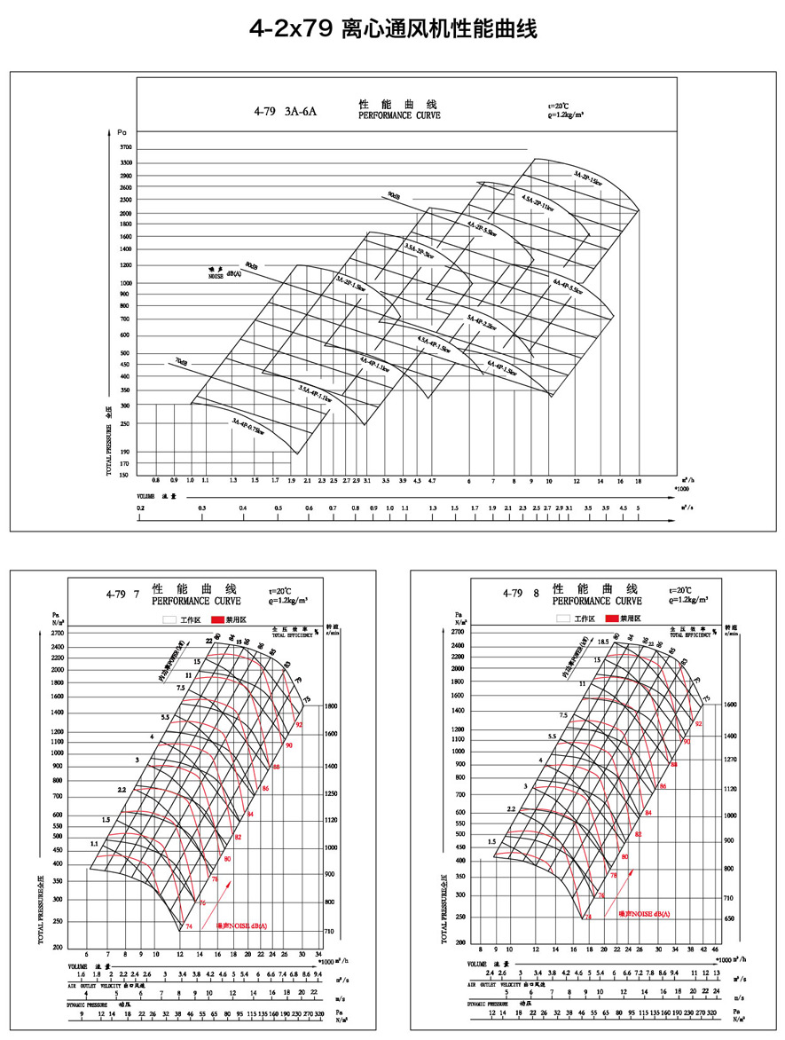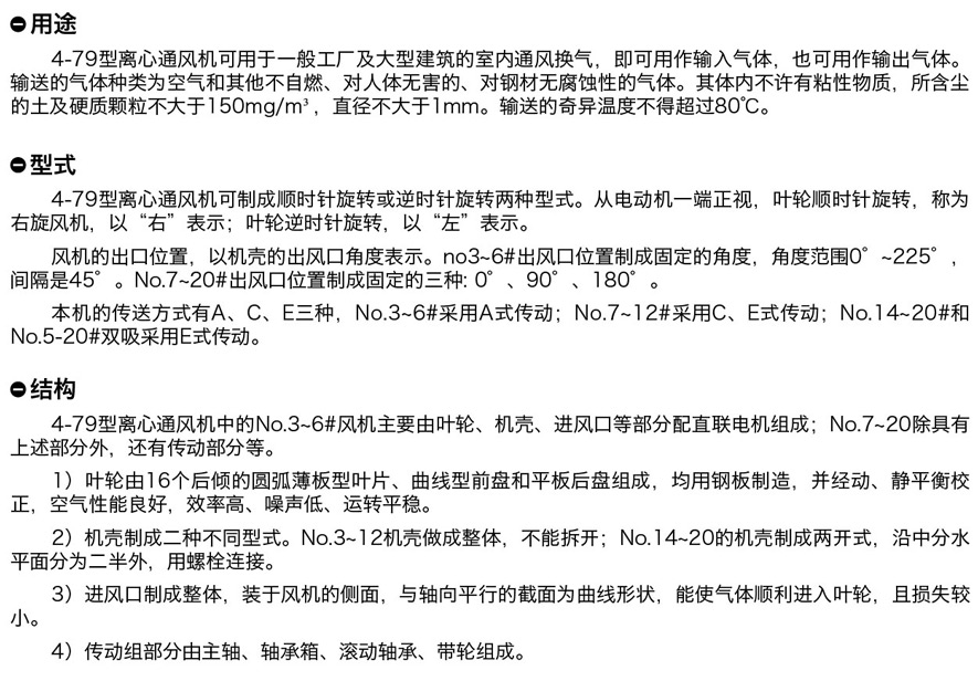 4-79型離心通風機可用于一般工廠及大型建筑的室內通風換氣,即可用作輸入氣體,也可用作輸出氣體。 輸送的氣體種類為空氣和其他不自燃、對人體無害的、對鋼材無腐蝕性的氣體。 其體內不許有粘性物質,所含塵 的土及硬質顆粒不大于150mg/m3,直徑不大于1mm。 輸送的奇異溫度不得超過80°C。