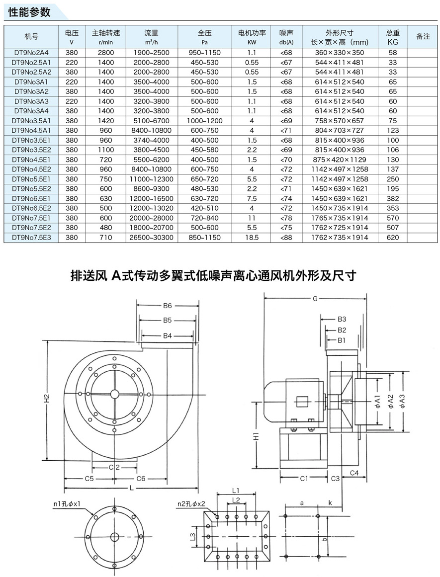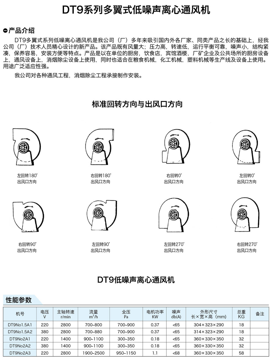 DT9多翼式系列低噪離心通風機是我公司(廠)多年來吸引國內外各廠家、同類產品之長的基礎上,經我 公司(廠)技術人員精心設計的新產品。