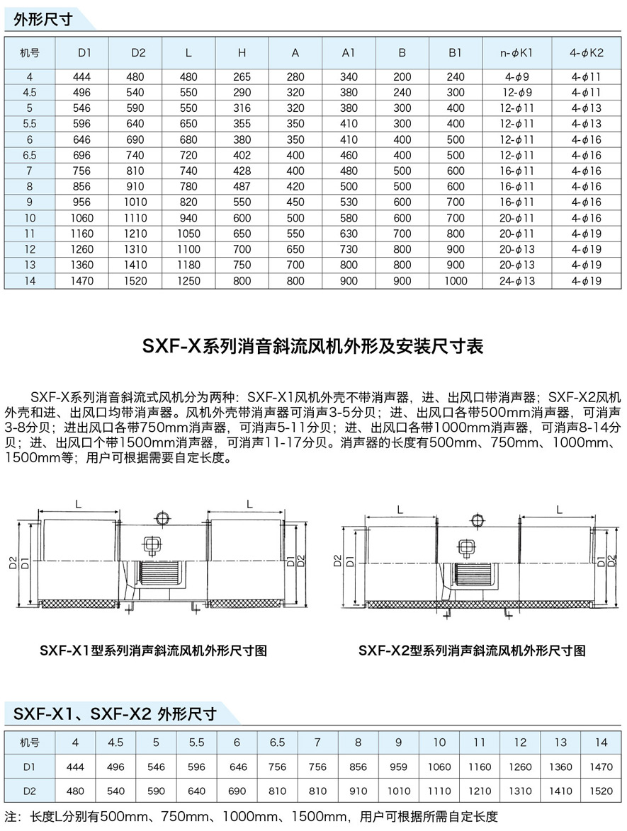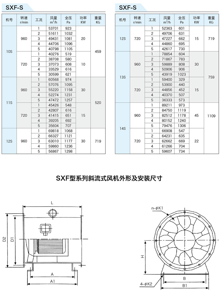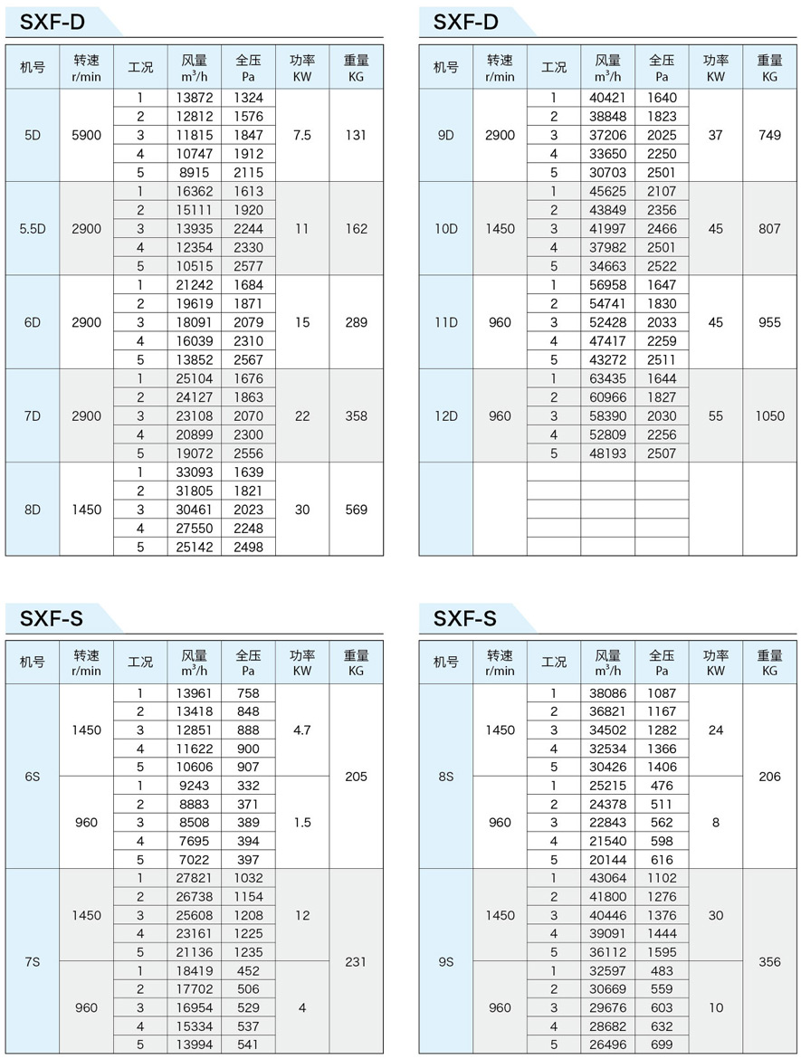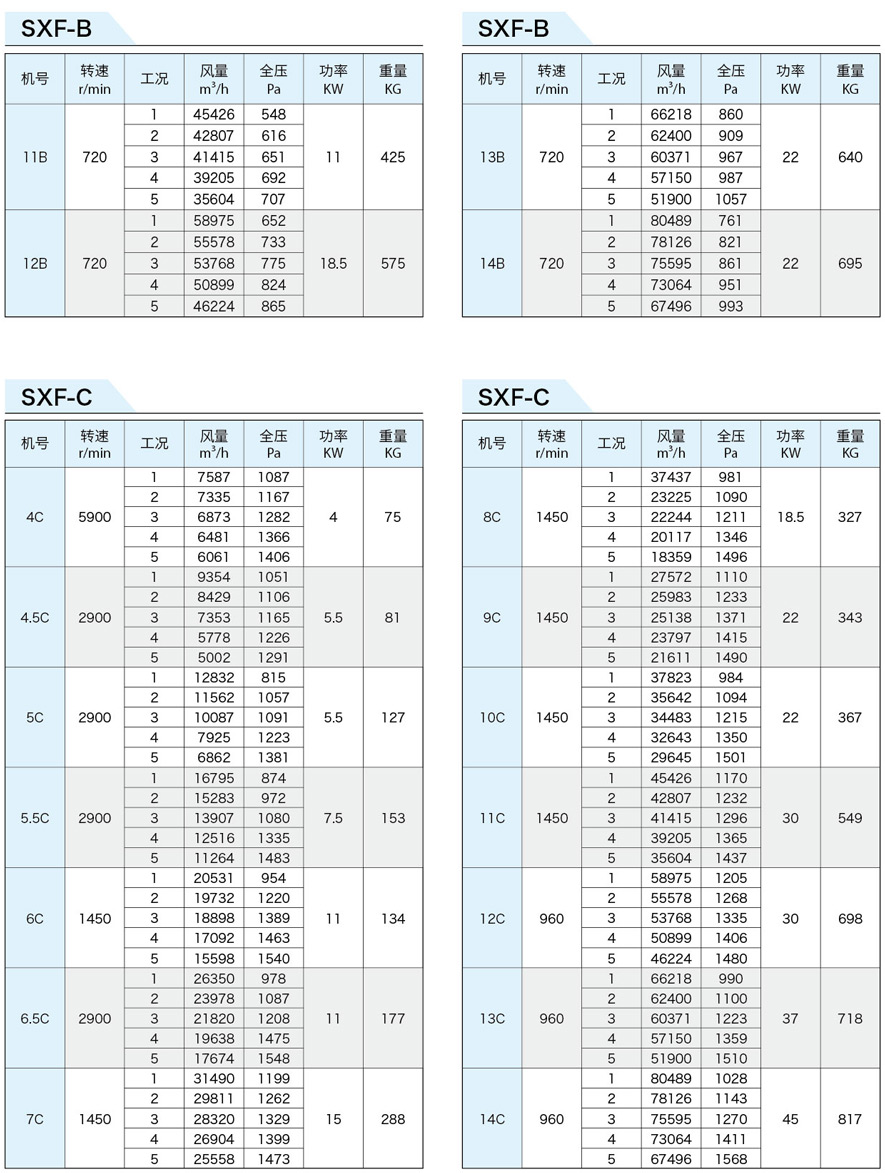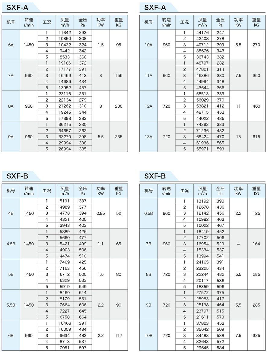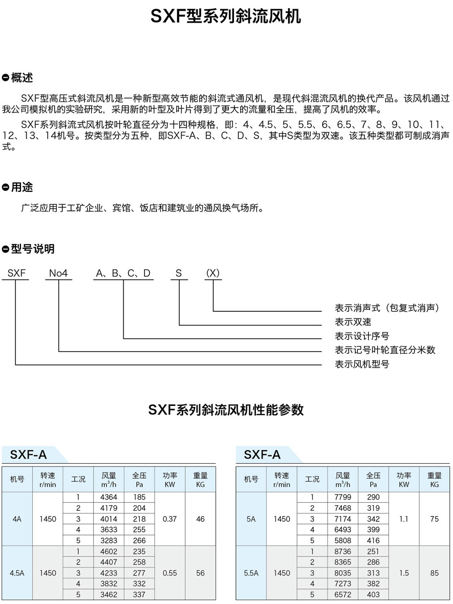 SXF系列斜流式風(fēng)機(jī)按葉輪直徑分為十四種規(guī)格,即:4、4.5、5、5.5、6、6.5、7、8、9、10、11、12、13、14機(jī)號(hào)。按類型分為五種,即SXF-A、B、C、D、S,其中S類型為雙速。該五種類型都可制成消聲