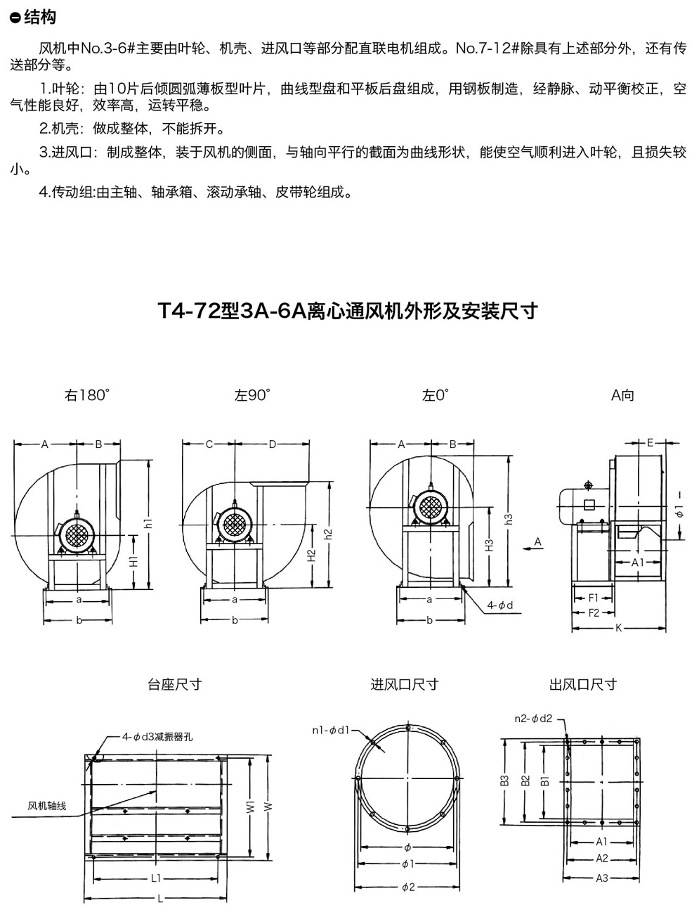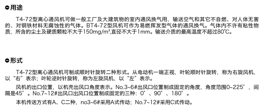 T4-72型離心通風機可做一般工廠及大建筑物的室內通風換氣用,輸送空氣和其它不自燃、對人體無害 的、對鋼鐵材料無腐蝕性的氣體。BT4-72型風機可作為易燃揮發型氣體的通風換氣。氣體內不許有粘性物 質,所含的塵土及硬質顆粒不大于150mg/m3,直徑不大于1mm。輸送介質的最高溫度不超過80°C。